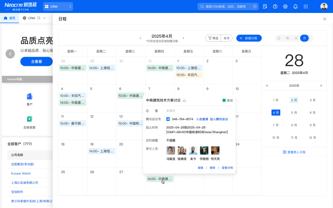 在销售易中预定会议后,系统将自动为不同参会人生成专属会议邀请链接,并自动同步至CRM、腾讯会议与企业微信日程等多平台,不需要在各群里转发艾特?;崆暗娜捞嵝延行П苊庖怕?。