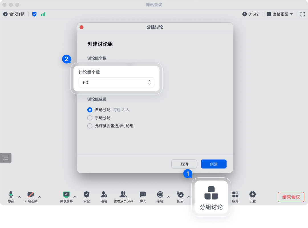 大容量的同时,商业版也做好了“秩序管理”,一方面,商业版单场会议至多设置50个分组讨论,不用新开会议即可在原有会议号里分组讨论,提升培训、课程等场景下的互动感。