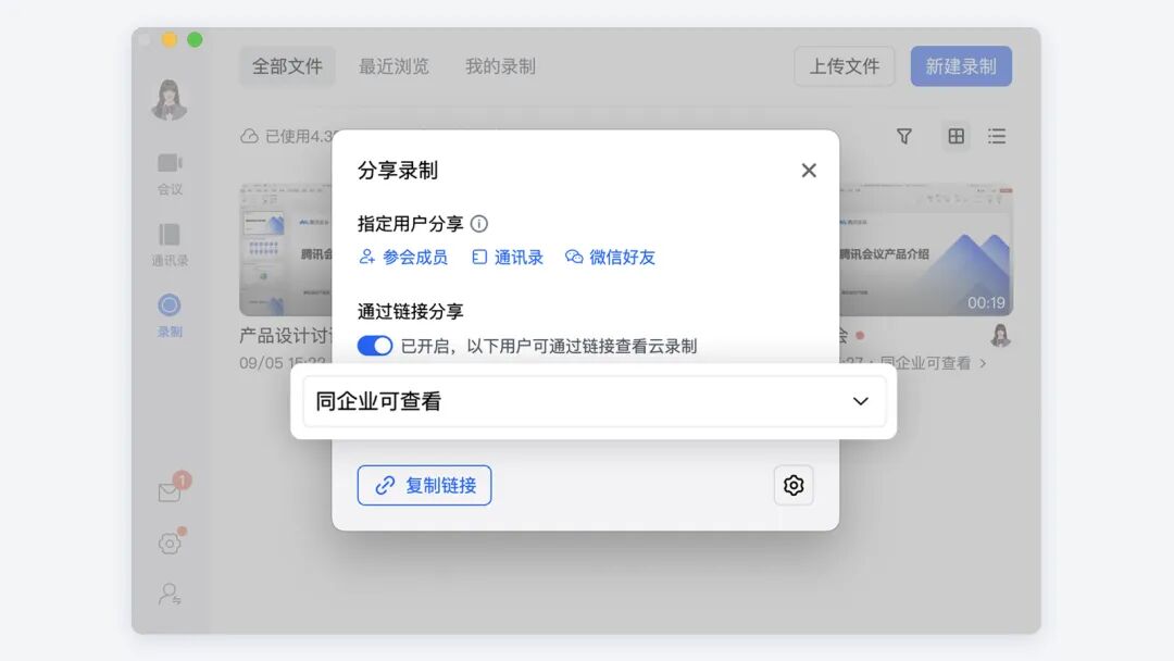 对于主持人来说,还有个非常省心的地方?;嵋榻崾?,会议云录制文件能够一键设置为“同企业可查看”,主持人再也不用当“工具人”逐一审批了。