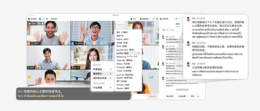 当我们召开多语言会议时,您就可以使用腾讯会议的翻译功能,支持17种语言:中文、英语、日语、韩语、俄语、泰语、印尼语、越南语、马来语、菲律宾语、葡萄牙语、土耳其语、阿拉伯语、西班牙语、印地语、法语、德语。搭配AI小助手以及智能录制使用,让您更快捷抓住会议重点,梳理待办。